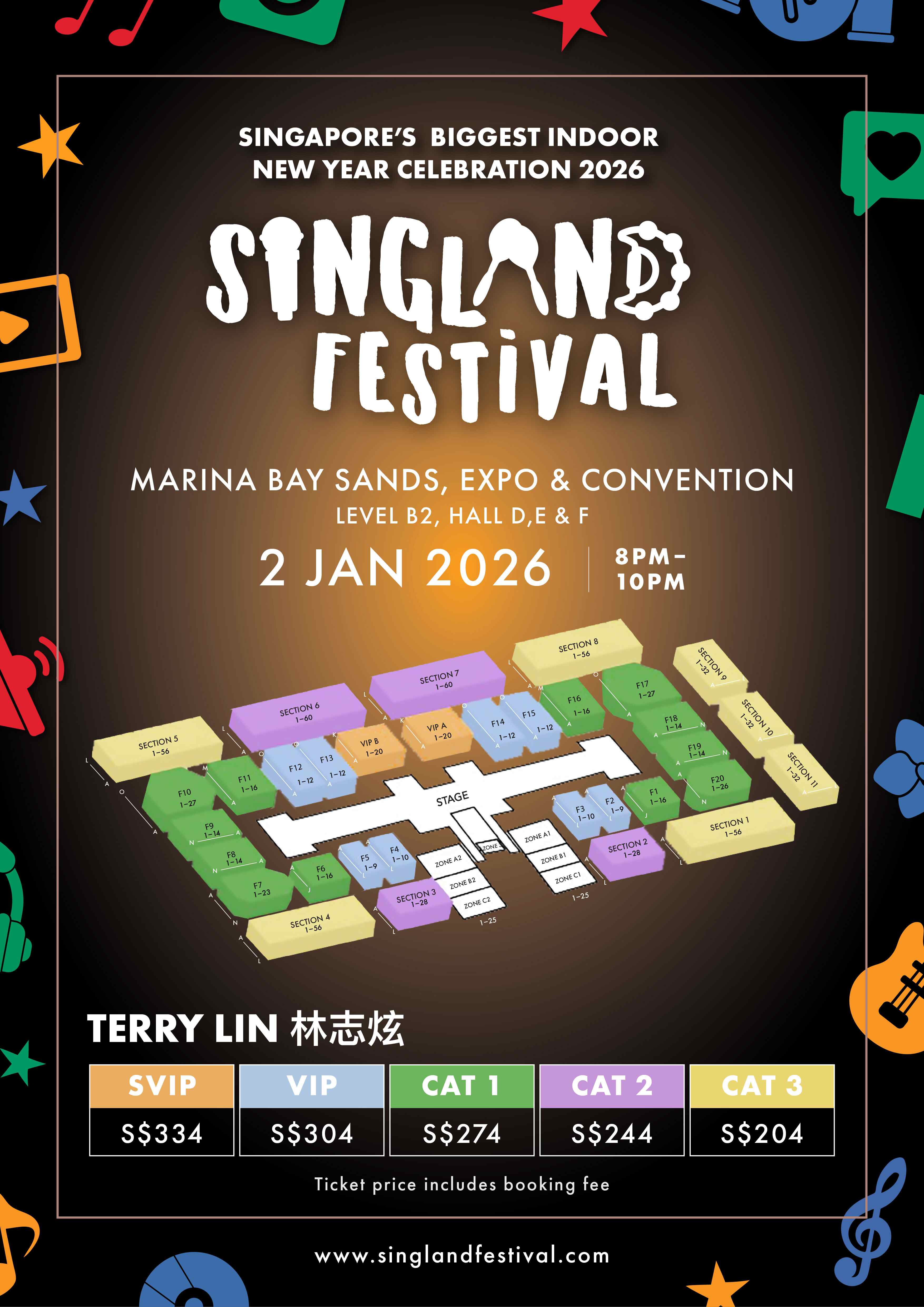 为庆祝新加坡建国 60 周年,SINGLAND FESTIVAL 融合震撼现场演出、尖端舞台制作与沉浸式互动体验。每场演出风格各异——流行、R&B、抒情、跨界,配合震撼视觉与音效,带来全方位感官震撼。