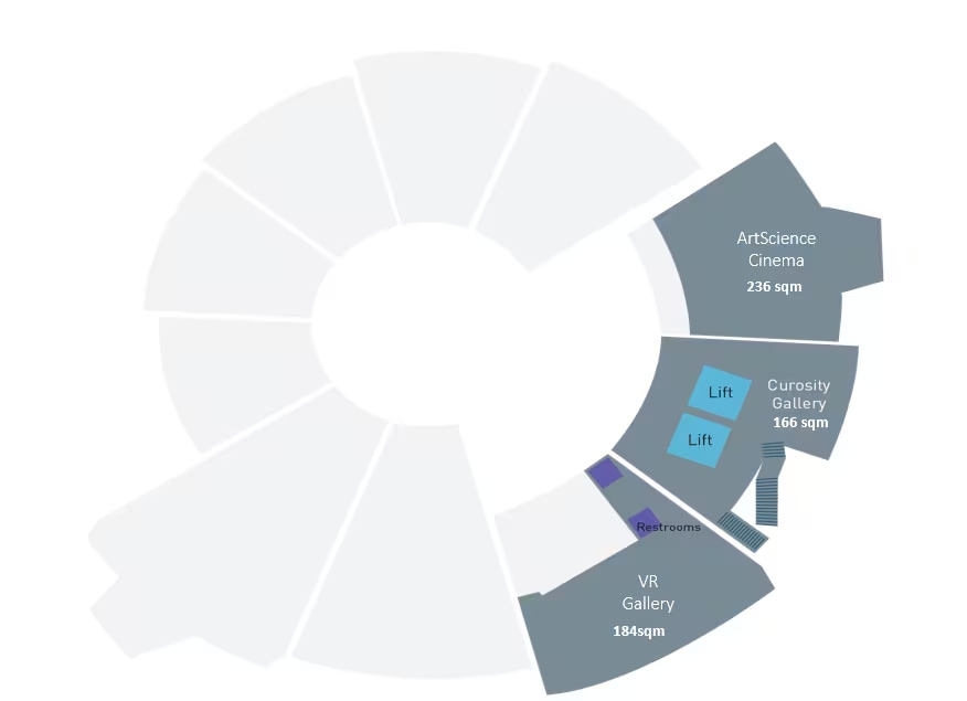 艺术科学博物馆由 10 只“手指”形状的建筑结构组成,其中的 3 只打造成位于第 4 层的 3 个展厅 - 艺术科学影院、电梯门厅和 VR 展厅。三个场地适合举办不同类型的活动,须打包预订。