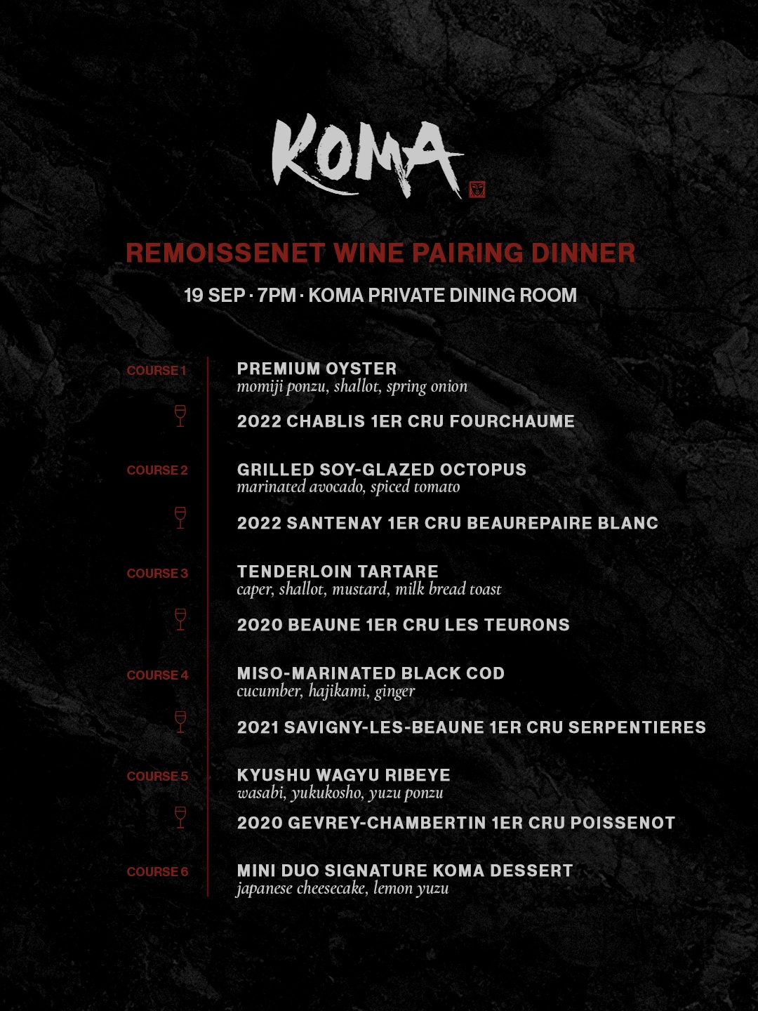 出品众多精心手调的鸡尾酒,藏有世界各地葡萄酒、清酒和烈酒,KOMA 为八方来客缔造难忘之夜。